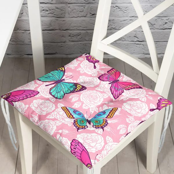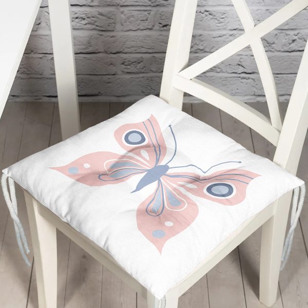 Pembe Kelebek Tasarımlı Dijital Baskılı Modern Pofuduk Sandalye Minderi