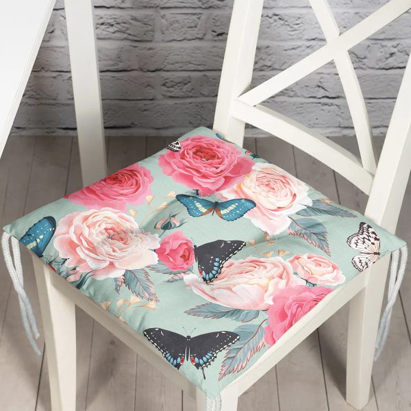 Kelebek Ve Gül Motifli Dijital Baskılı Özel Tasarım Modern Pofuduk Sandalye Minderi