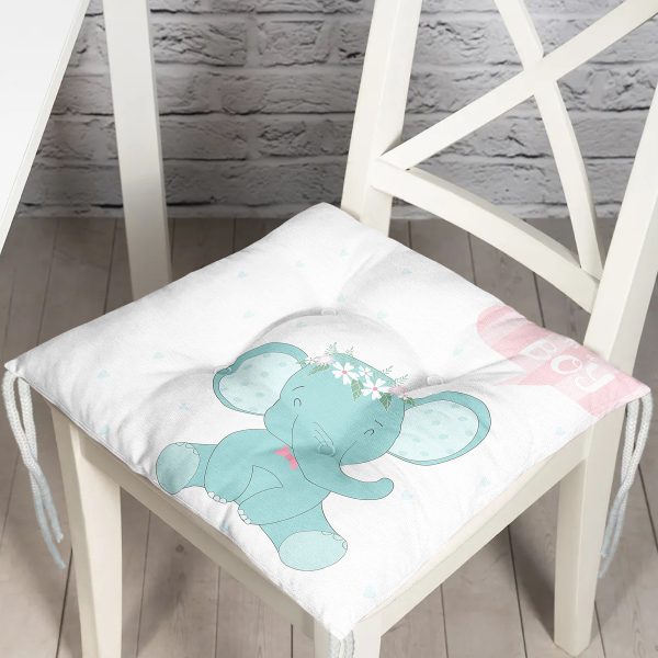 Beyaz Zemin Sevimli Fil Desenli Özel Tasarımlı Dijital Baskılı Çocuk Odası Pofuduk Sandalye Minderi