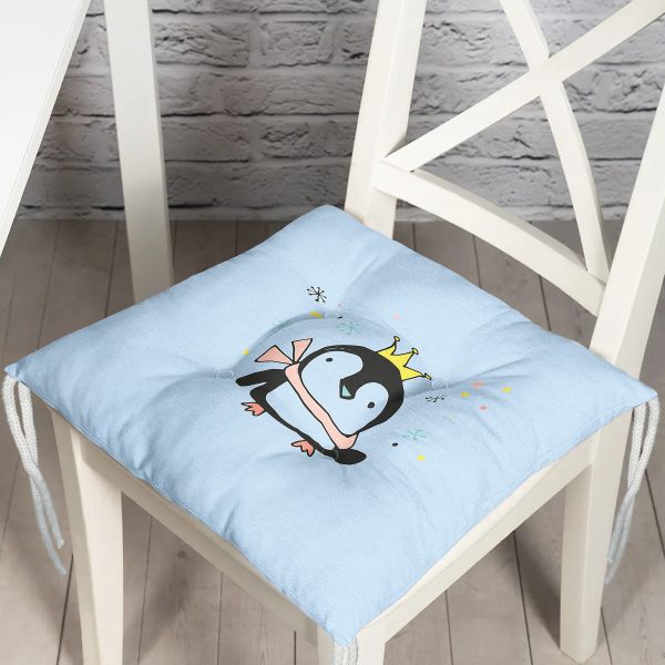 Mavi Zeminli Sevimli Atkılı Penguen Desenli Dijital Baskılı Modern Pofuduk Sandalye Minderi