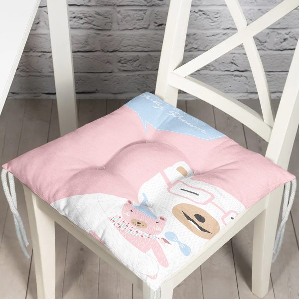 Pembe Zeminde Anne Ve Yavru Ayı Baby Shower Dijital Baskılı Çocuk Odası Pofuduk Sandalye Minderi