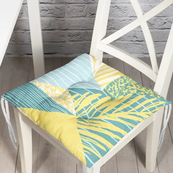 Renkli Zemin Üzerinde Geometrik Desenli Yaprak Motifli Dijital Baskılı Modern Pofuduk Sandalye Minderi