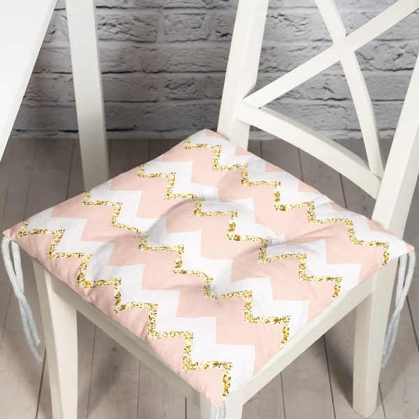 Pembe Zemin Üzerinde Gold Detaylı Renkli Zikzak Desenli Dijital Baskılı Modern Pofuduk Sandalye Minderi