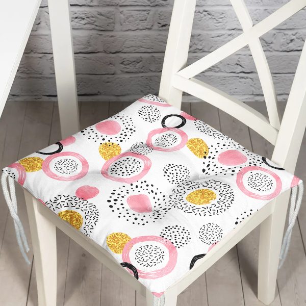 Beyaz Zeminde Gold Detaylı Renkli Puantiye Desenli Dijital Baskılı Modern Pofuduk Sandalye Minderi