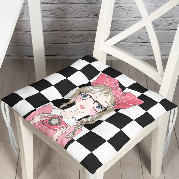 Dama Zeminli Fotoğraf Çeken Kız Tasarımlı Dijital Baskılı Modern Pofuduk Sandalye Minderi