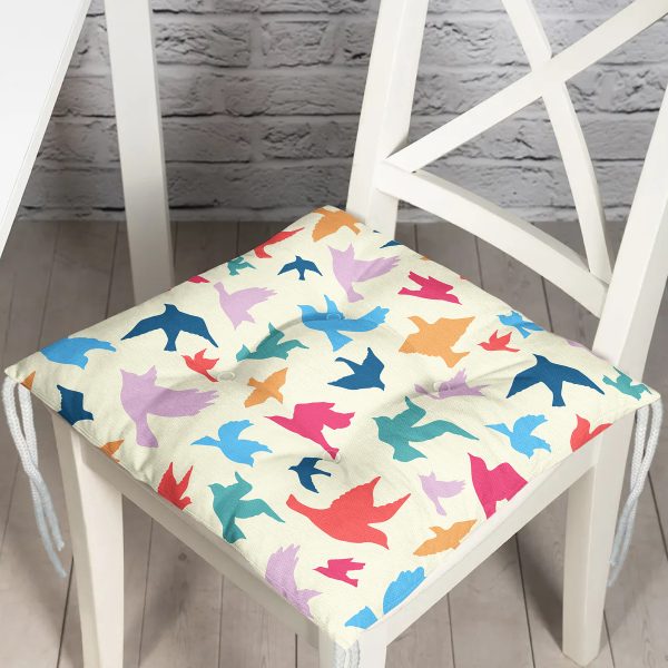 Krem Zeminde Renkli Kuşlar Motifli Dijital Baskılı Modern Pofuduk Sandalye Minderi