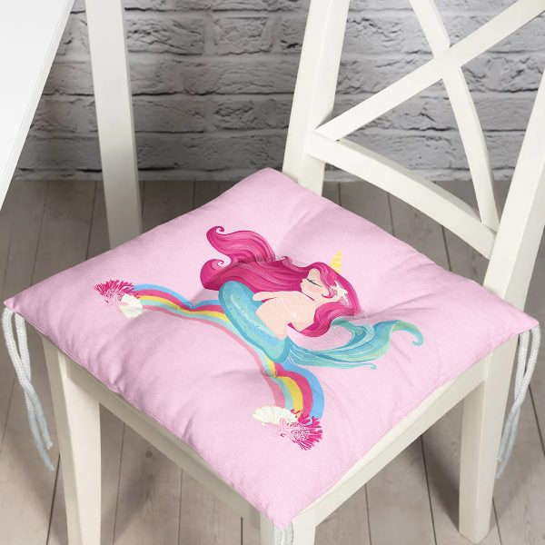 Pembe Zeminde Denizkızı Desenli Dijital Baskılı Çocuk Odası Pofuduk Sandalye Minderi