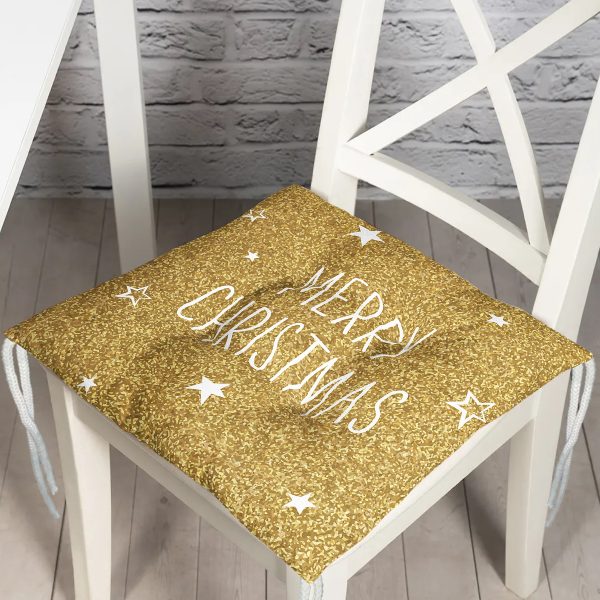 Gold Zeminde Merry Christmas Yazılı Dijital Baskılı Modern Pofuduk Sandalye Minderi