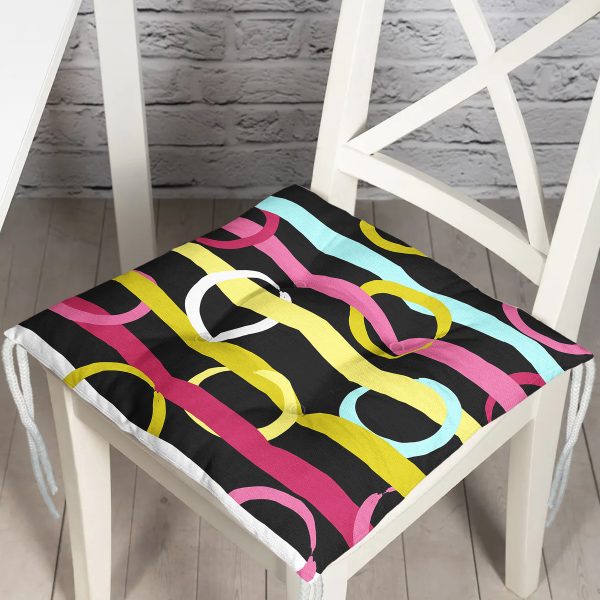 Siyah Zemin Üzerinde Modern Çizgili Renkli Puantiyeli Dijital Baskılı Modern Pofuduk Sandalye Minderi