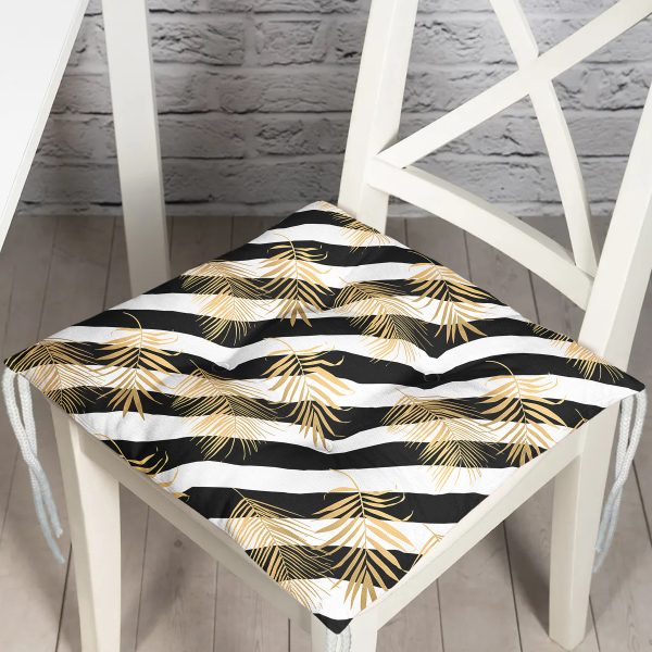 Beyaz Zemin Üzerinde Gold Detaylı Yaprak Desenli Dijital Baskılı Modern Pofuduk Sandalye Minderi