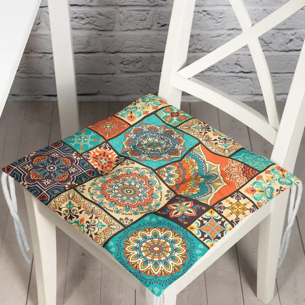 Renkli Zemin Üzerinde Geometrik Desenli Dijital Baskılı Modern Pofuduk Sandalye Minderi