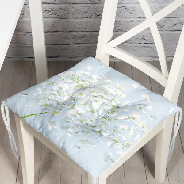 Mavi Zeminde Beyaz Ortanca Çiçeği Baskılı Pofuduk Sandalye Minderi