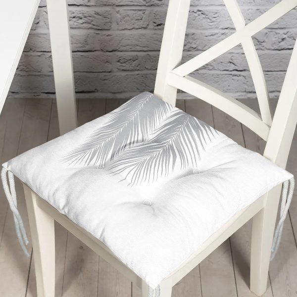 Beyaz Zeminde Gri Palmiye Yaprakları Özel Tasarım Pofuduk Sandalye Minderi