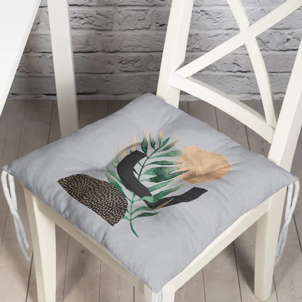 Gri Zemin Üzerinde Soyut Yaprak Çizimli Modern Özel Tasarım Pofuduk Sandalye Minderi