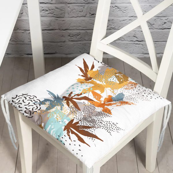 Beyaz Zeminde Mavi Ve Turuncu Yaprak Desenli Pofuduk Sandalye Minderi