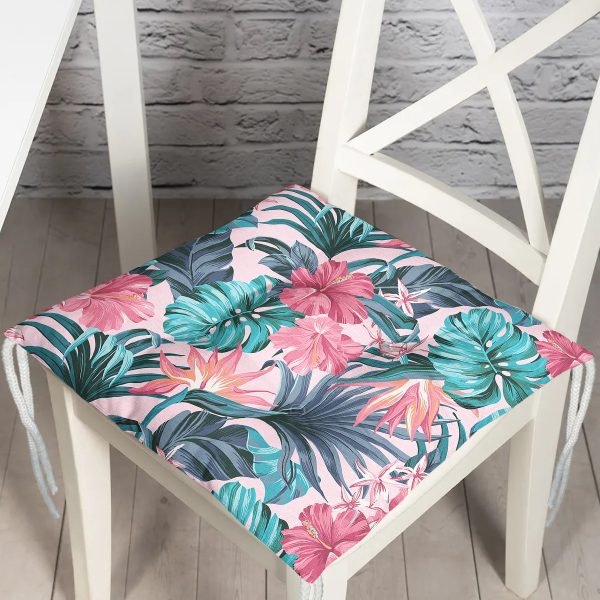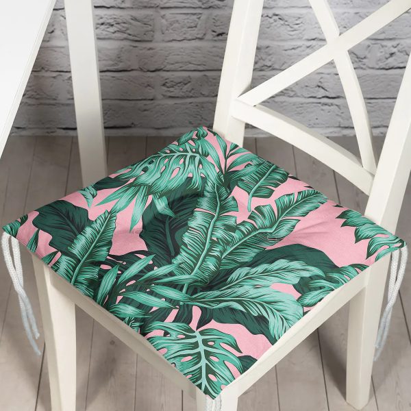 Pembe Zeminde Canlı Tropik Yaprakları Dijital Baskılı Pofuduk Sandalye Minderi
