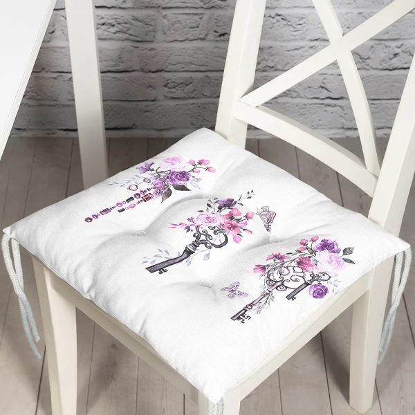 Mor Renk Anahtar Motifli Çiçek Desenli Çizgili Pofuduk Sandalye Minderi