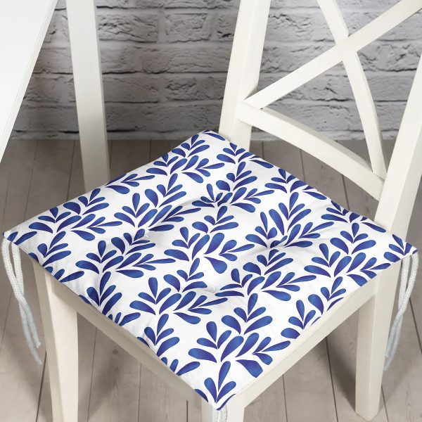 Beyaz Zemin Üzerinde Mavi Yaprak Desenli Dijital Baskılı Modern Pofuduk Sandalye Minderi