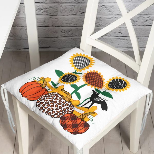 Beyaz Zemin Üzerinde Ayçiçek Desenli Ekoseli Balkabağı Dijital Baskılı Modern Pofuduk Sandalye Minderi