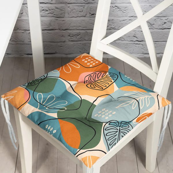 Renkli Zemin Üzerinde Onedraw Çizimli Yaprak Desenli Dijital Baskılı Modern Pofuduk Sandalye Minderi