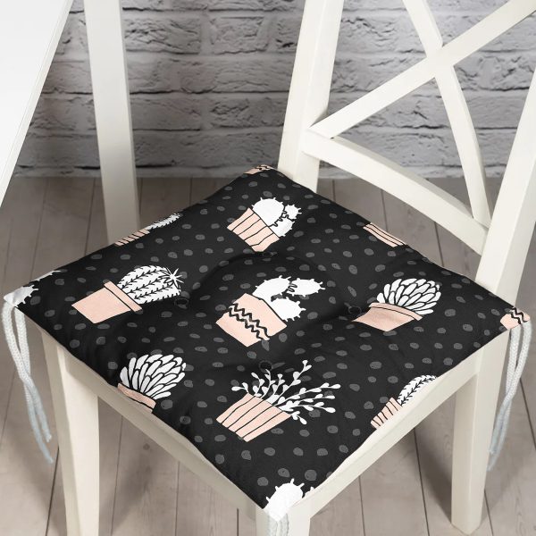 Siyah Zemin Üzerinde Kaktüs Desenli Dijital Baskılı Modern Pofuduk Sandalye Minderi