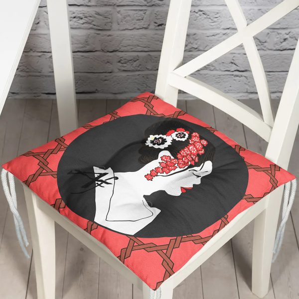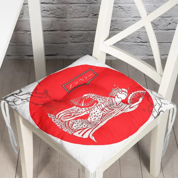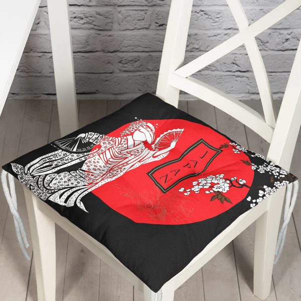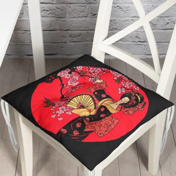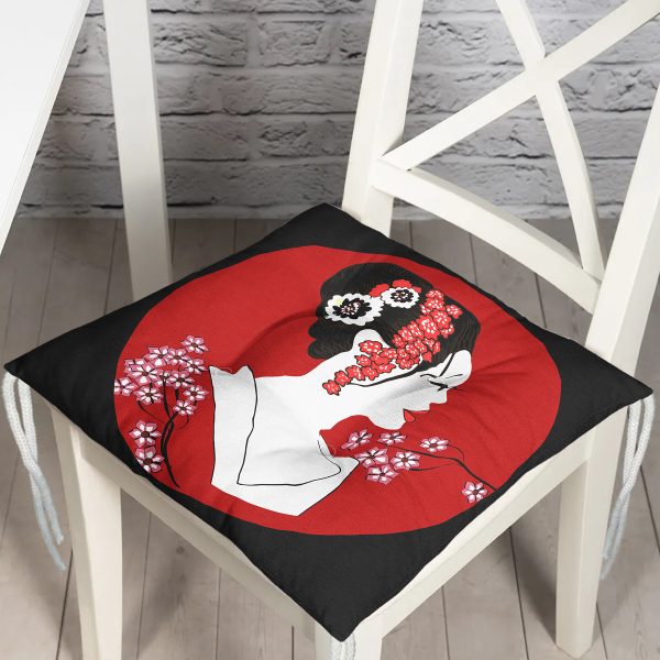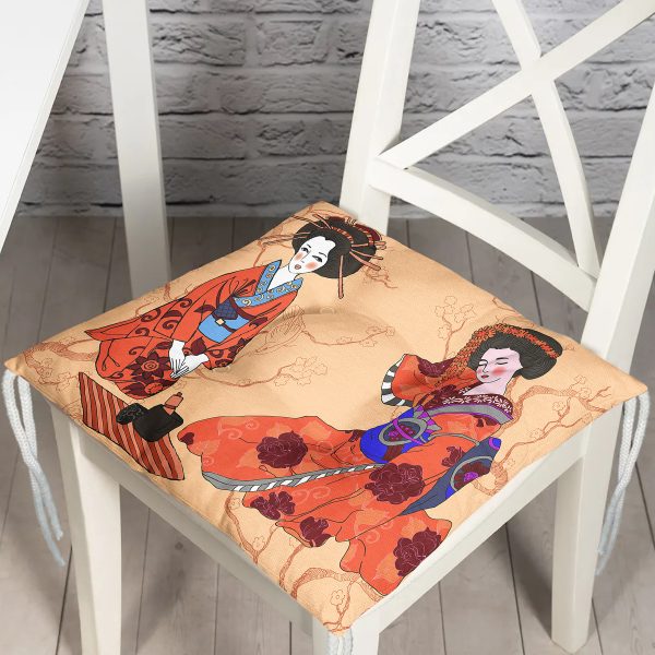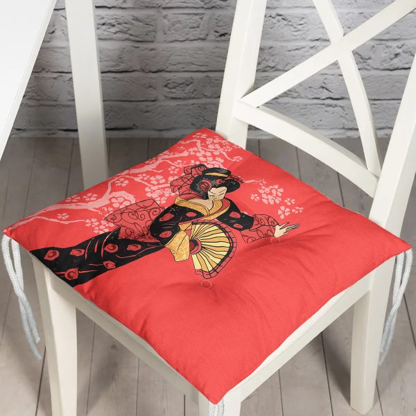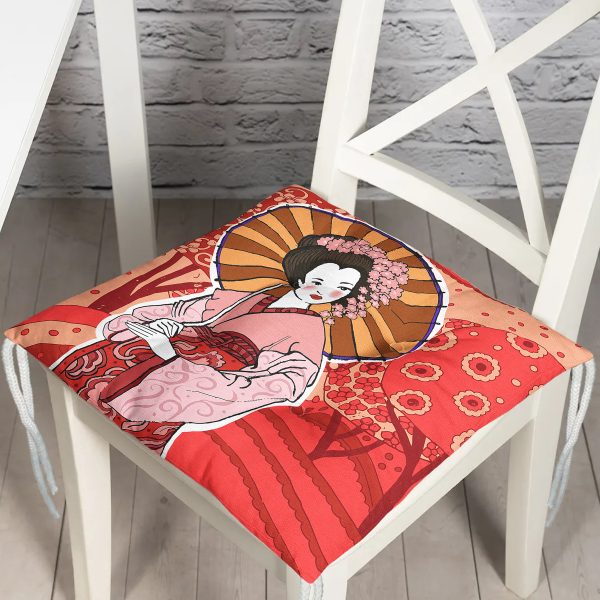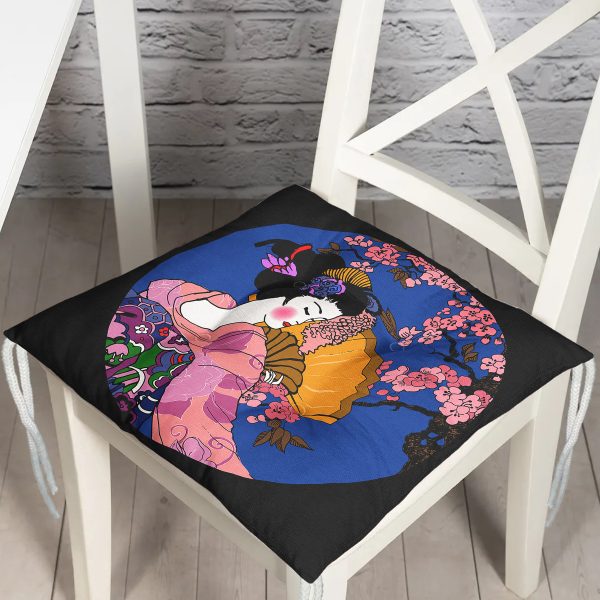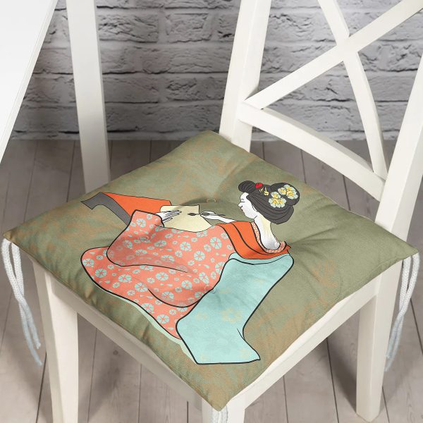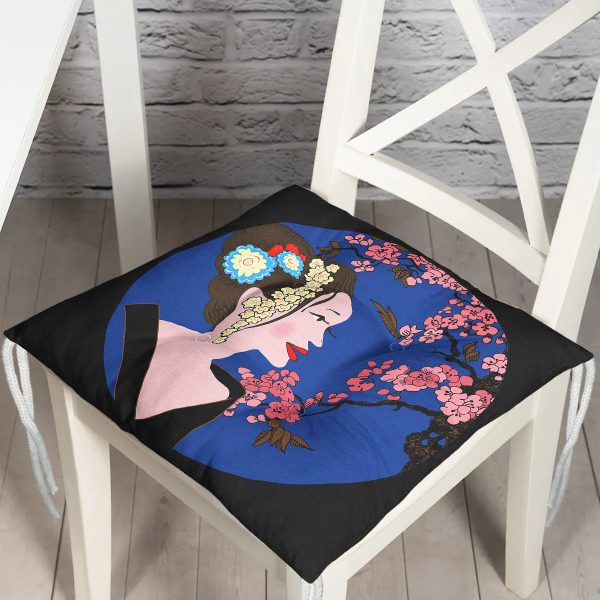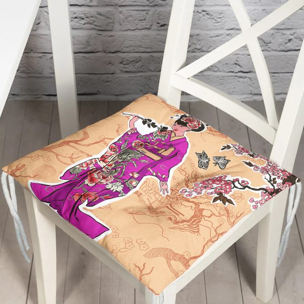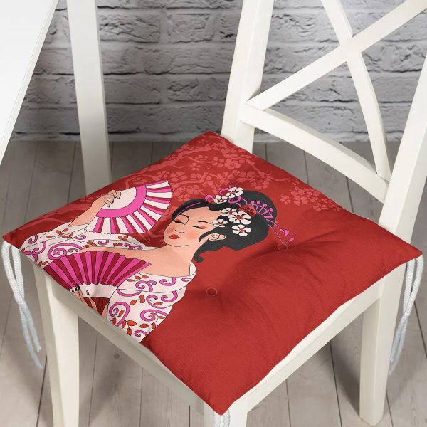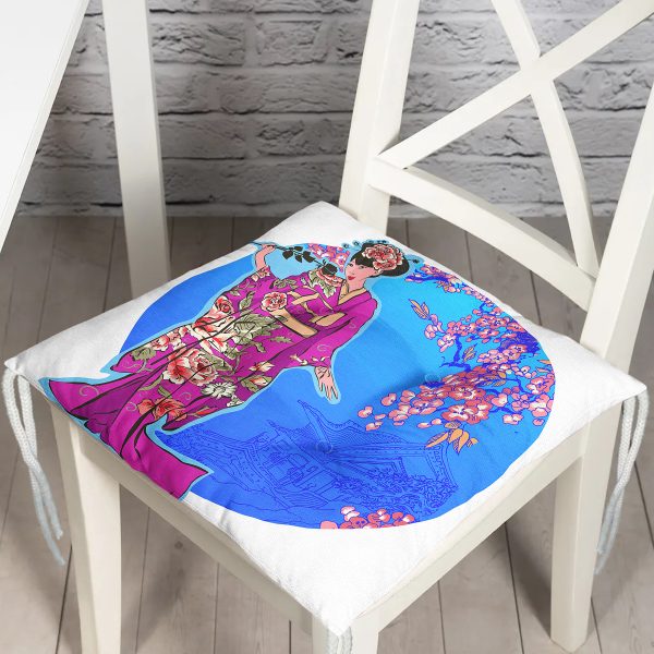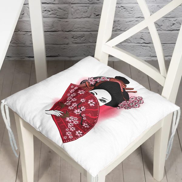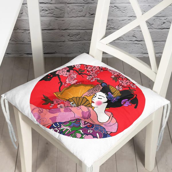 Uzak Doğu Kültürlü Japon Kadın Dijital Baskılı Dekoratif Pofuduk Sandalye Minderi