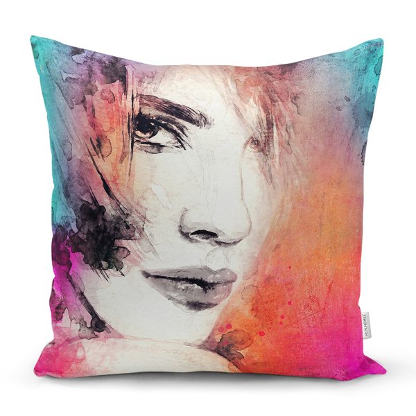 Suluboya Kadın Figürü Dijital Baskılı Dekoratif Modern Yastık Kırlent Kılıfı