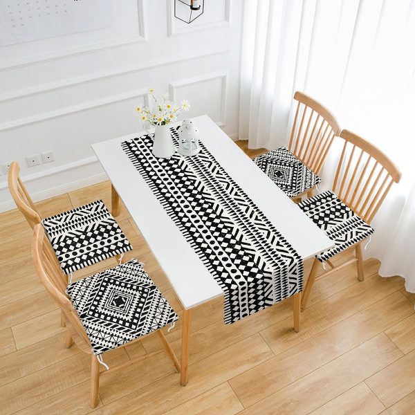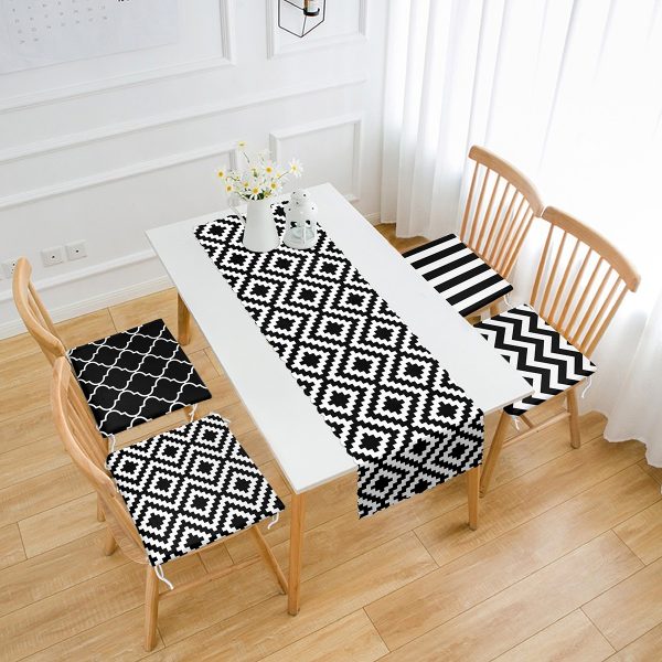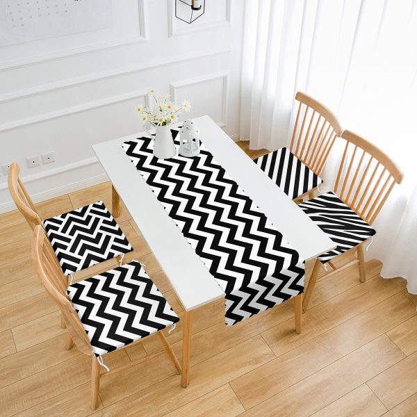 Siyah Beyaz Geometrik Tasarımlı 4 Fermuarlı Sandalye Minderi ve 1 Runner Seti