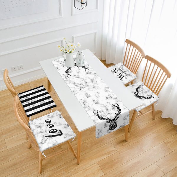Siyah Mermer Motifli 4 Pofuduk Sandalye Minderi ve 1 Runner Seti