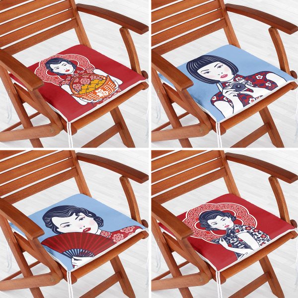 4’lü Kırmızı Ve Mavi Japon Kız Tasarımlı Dekoratif Fermuarlı Sandalye Minderi Seti