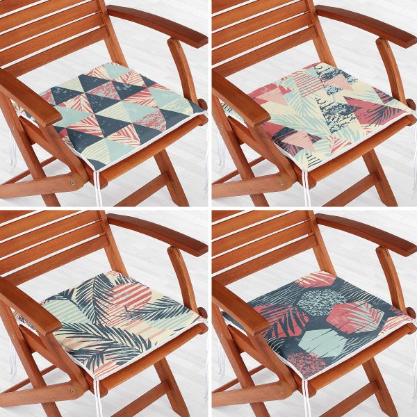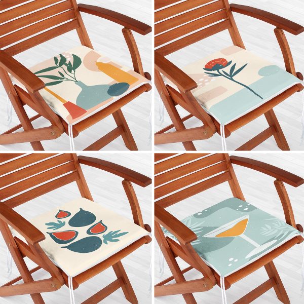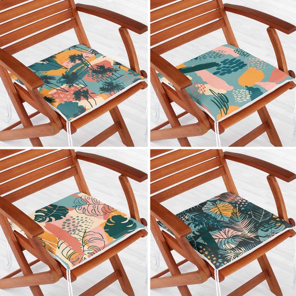 4’lü Renkli Zemin Üzerinde Yaprak Desenli Modern Fermuarlı Sandalye Minderi Seti