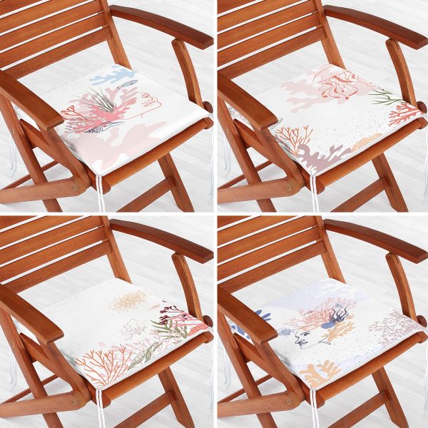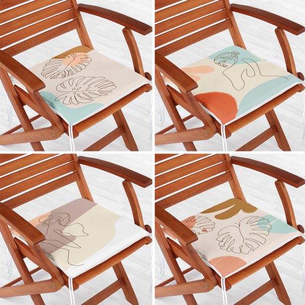 4’lü Renkli Zemin Üzerinde Onedraw Çizimli Yaprak Desenli Modern Fermuarlı Sandalye Minderi Seti