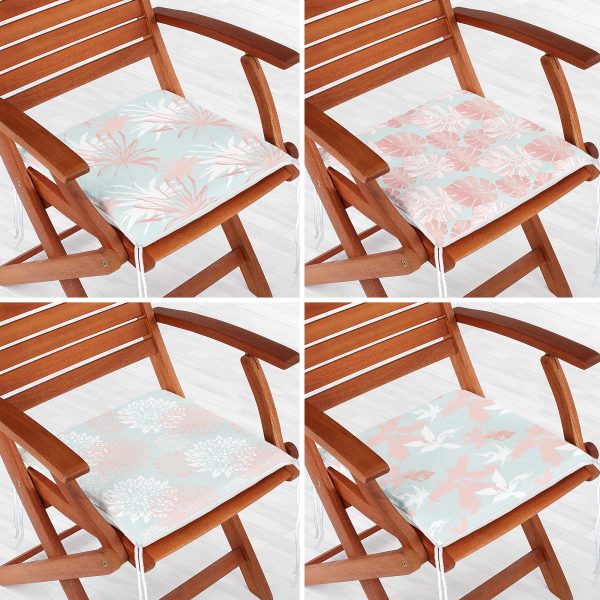 4’lü Mavi Zeminde Pembe Ve Beyaz Yaprak Çizimli Modern Fermuarlı Sandalye Minderi Seti