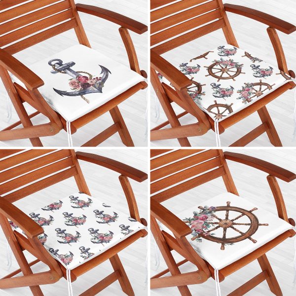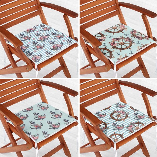 4’lü Mavi Zemin Dümen & Çapa Motifli Dijital Baskılı Modern Fermuarlı Sandalye Minderi Seti