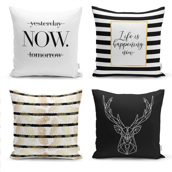 Realhomes Gold Yazılı Siyah Beyaz Zeminli 4’lü Dekoratif Yastık Kırlent Kılıfı