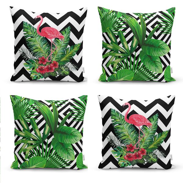 Realhomes Geometrik Çizgiler Üzerinde Tropikal Yaprak ve Flamingo 4’lü Yastık Kırlent Kılıfı