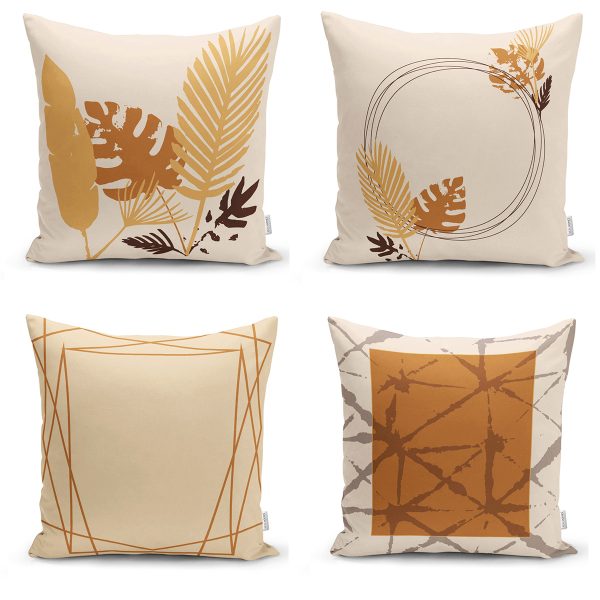 4’lü Renkli Zemin Üzerinde Gold Detaylı Yaprak Desenli Modern Yastık Kırlent Kılıf Seti