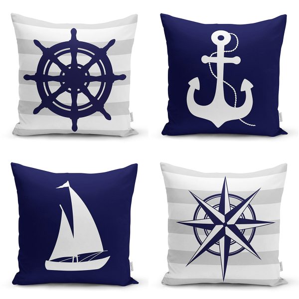 4lü Lacivert Beyaz Çapa Tasarımlı Dekoratig Yastık Kırlent Kılıf Seti