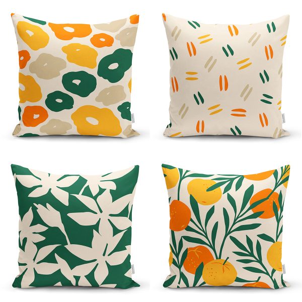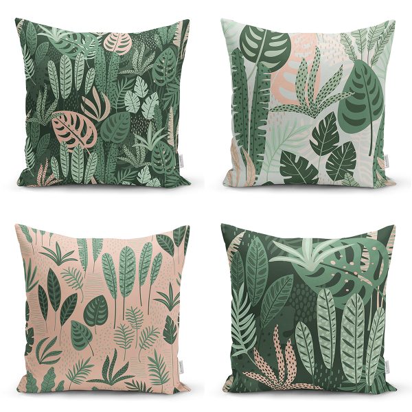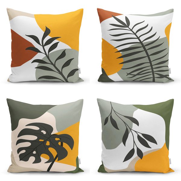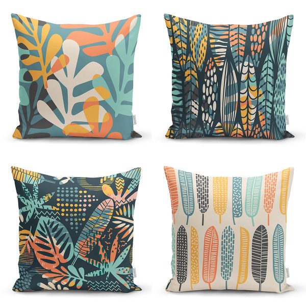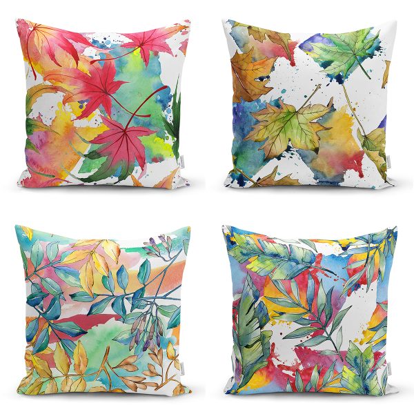 4’lü Renkli Zemin Üzerinde Yaprak Desenli Modern Yastık Kırlent Kılıf Seti