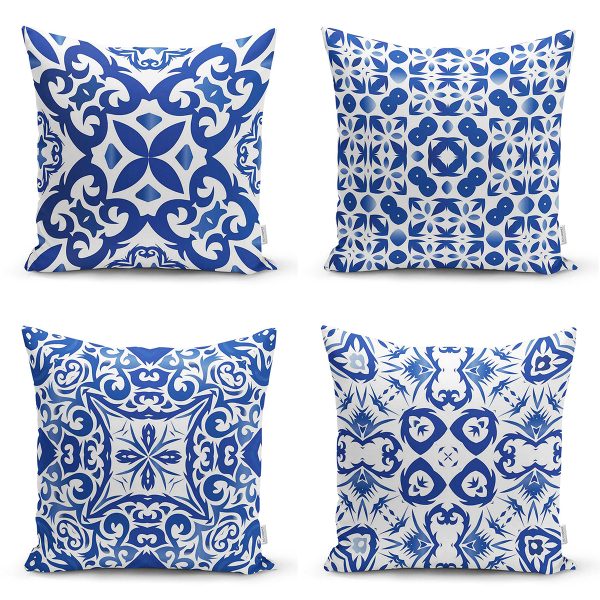 4’lü Beyaz Zemin Üzerinde Çini Desenli Modern Yastık Kırlent Kılıf Seti