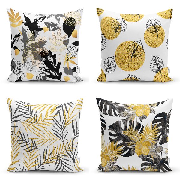 4’lü Beyaz Zemin Üzerinde Gold Detaylı Yaprak Desenli Modern Yastık Kırlent Kılıf Seti
