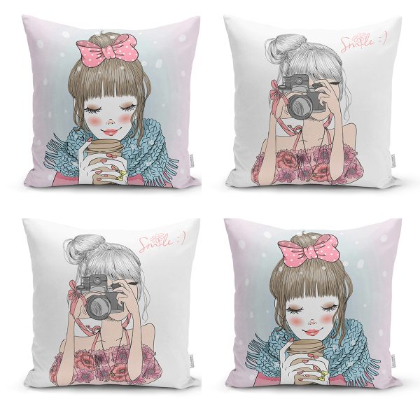 Realhomes Kahve İçen ve Fotoğraf Çeken Kız Kombinli 4’lü Yastık Kırlent Kılıfı