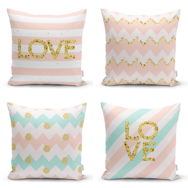 4’lü Beyaz Zemin Üzerinde Gold Detay Love Yazılı Modern Yastık Kırlent Kılıf Seti