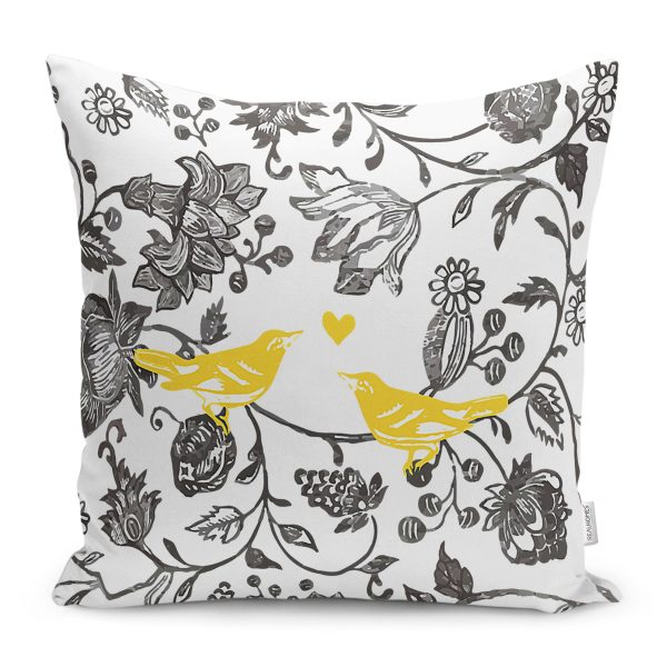 Realhomes Siyah Beyaz Çiçek Motifli Sarı Kuşlar Özel Tasarım Yastık Kırlent Kılıfı