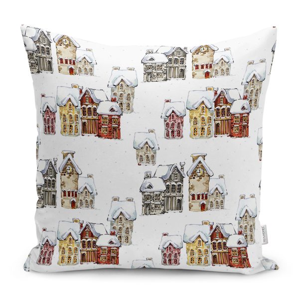 Realhomes Kış Temalı Karla Kaplı Evler Çizimli Dijital Baskılı Yastık Kırlent Kılıfı