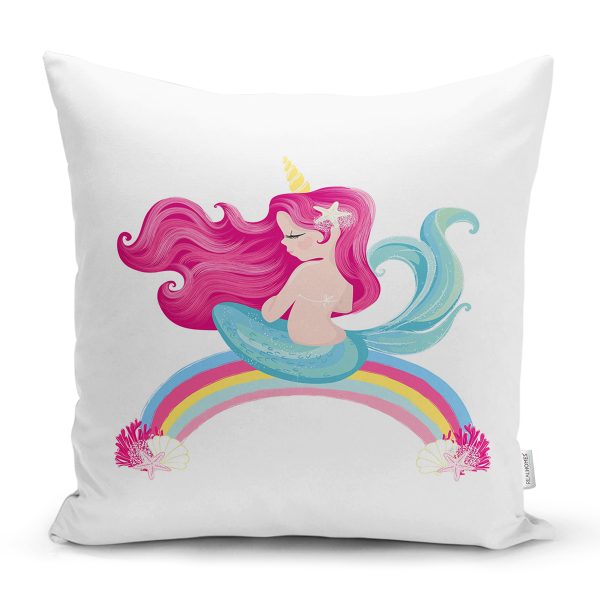 Realhomes Beyaz Zeminde Denizkızı Desenli Dijital Baskılı Modern Yastık Kırlent Kılıfı