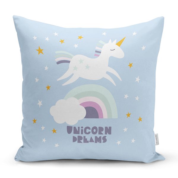 Mavi Zeminli Unicorn Desenli Özel Tasarımlı Dijital Baskılı Çocuk Odası Yastık Kırlent Kılıfı