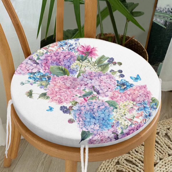 Renkli Zeminli Beyaz Ortanca Çiçek Desenli Dijital Baskılı Modern Yuvarlak Fermuarlı Sandalye Minderi