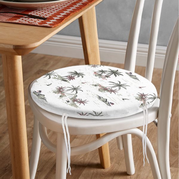 Beyaz Temalı Palmiye Adası Dijital Baskılı Yuvarlak Fermuarlı Sandalye Minderi
