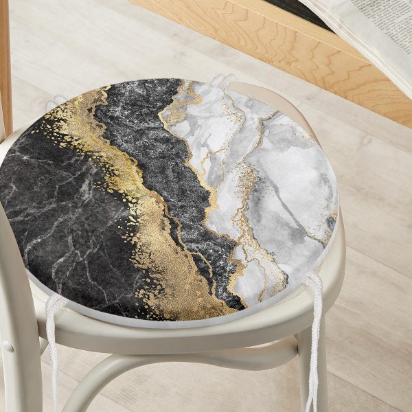 Modern Siyah Beyaz Altın Mermer Motifli Dijital Baskılı Yuvarlak Fermuarlı Sandalye Minderi